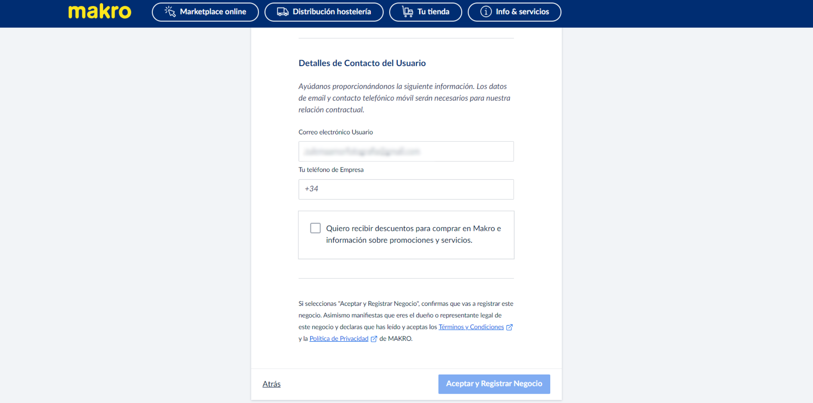 | Termina de completar tus datos personales para la titularidad de la tarjeta Makro y finalizar el alta y pulsa 'Aceptar y registrar Negocio'. Tras terminar el proceso deberás escribir a altaonline@makro.es para confirmar la finalización del trámite y te contactarán lo antes posible para confirmar tu alta con éxito o solicitarte información faltante. Cuando tu alta sea finalizada, tu tarjeta ya estará disponible en tu app. |