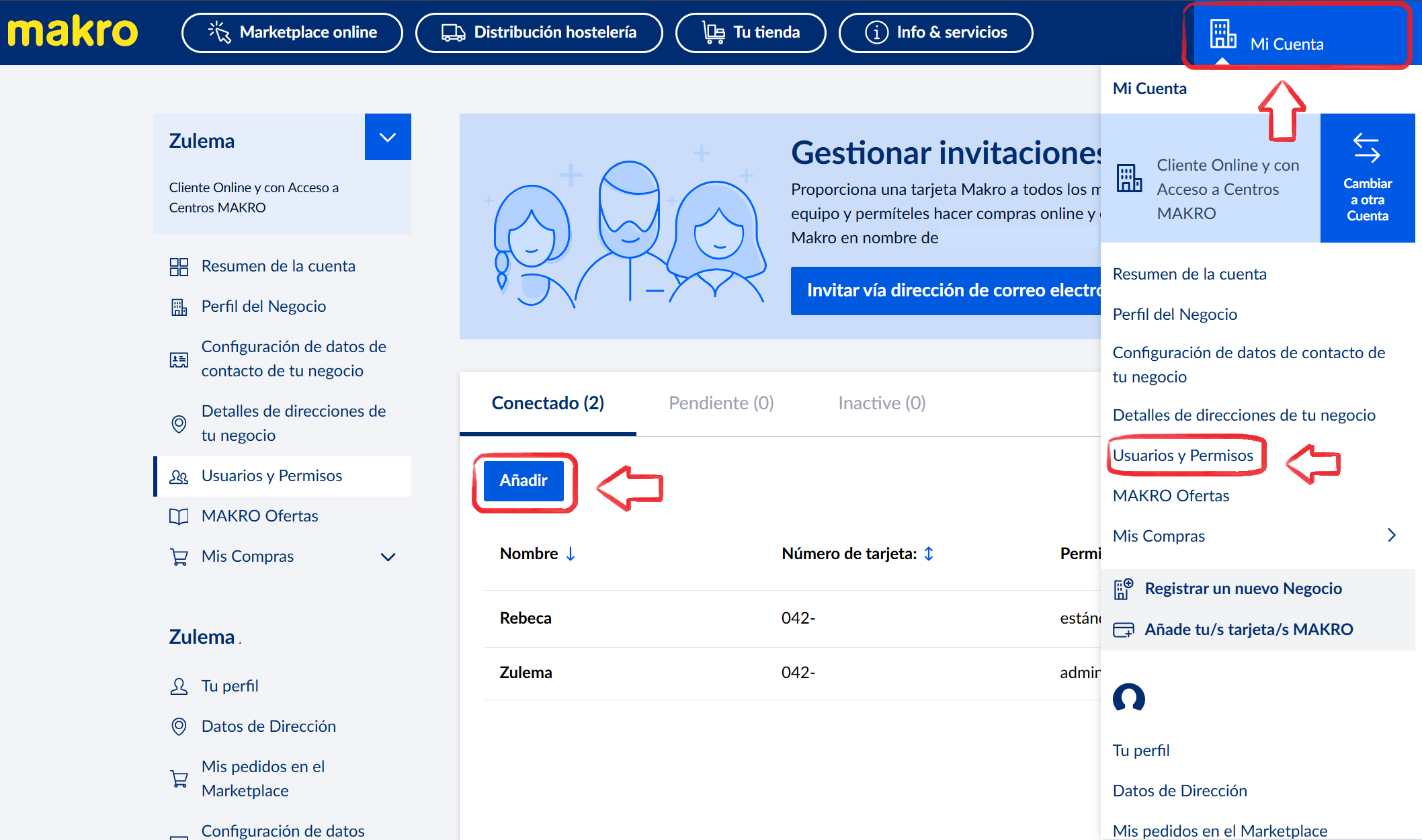 - Inicia sesión en www.makro.es con tu usuario y contraseña como titular/administrador, y selecciona Mi Cuenta en la parte superior derecha, y después Usuarios y Permisos, y por último, Añadir.