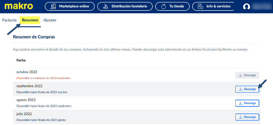 - Selecciona la opción de Descarga de cada mes que necesites el documento. Es decir, si quieres el año completo deberás descargarte las de todos los meses que hayas realizado compras.